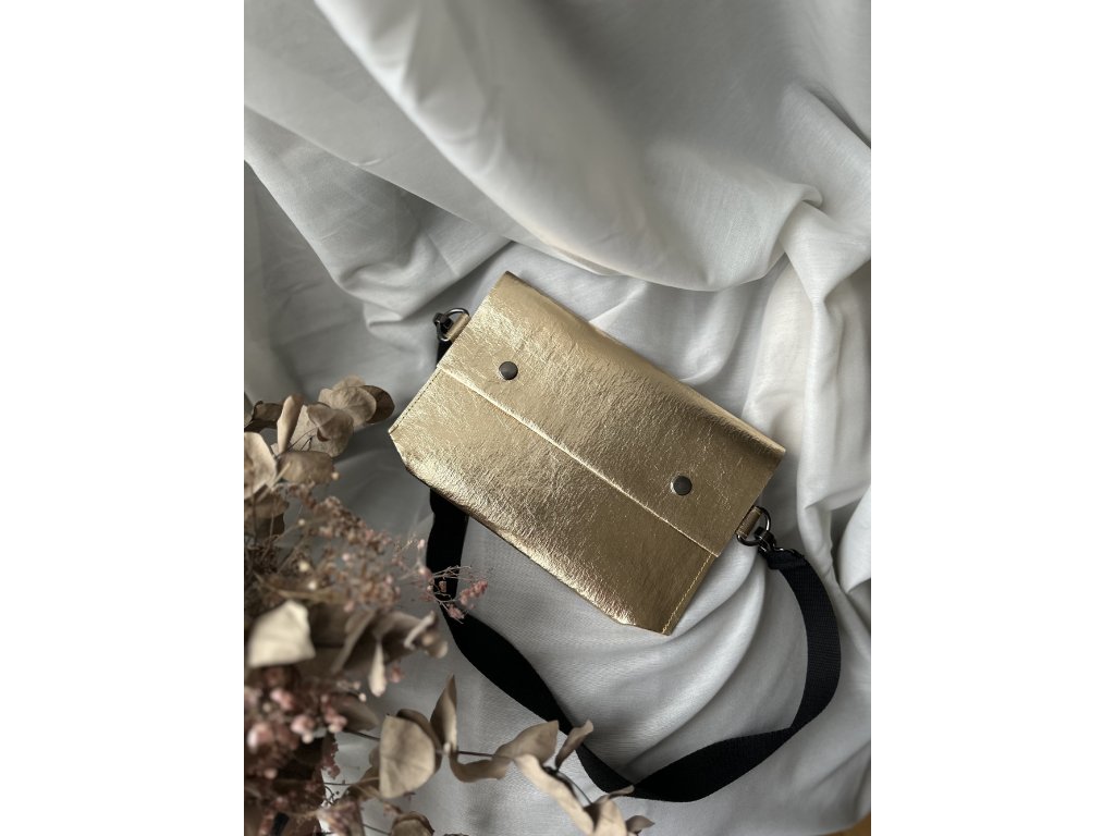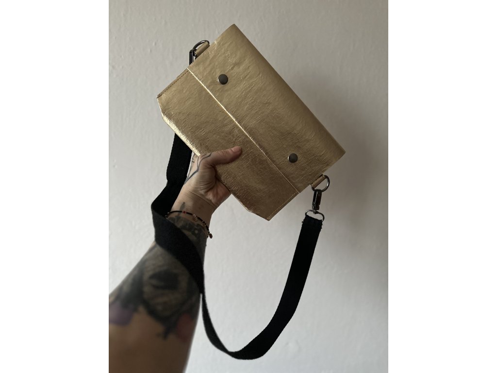 Crossbody kabelka z pratelného papíru . Kabelka má posuvný popruh přes rameno, uvnitř je všitá kapsa a zapínání je na cvoky. Dá se nosit jako crossbody nebo také jako ledvinka kolem pasu. Kabelku lze zhotovit v jiném barevném provedení.