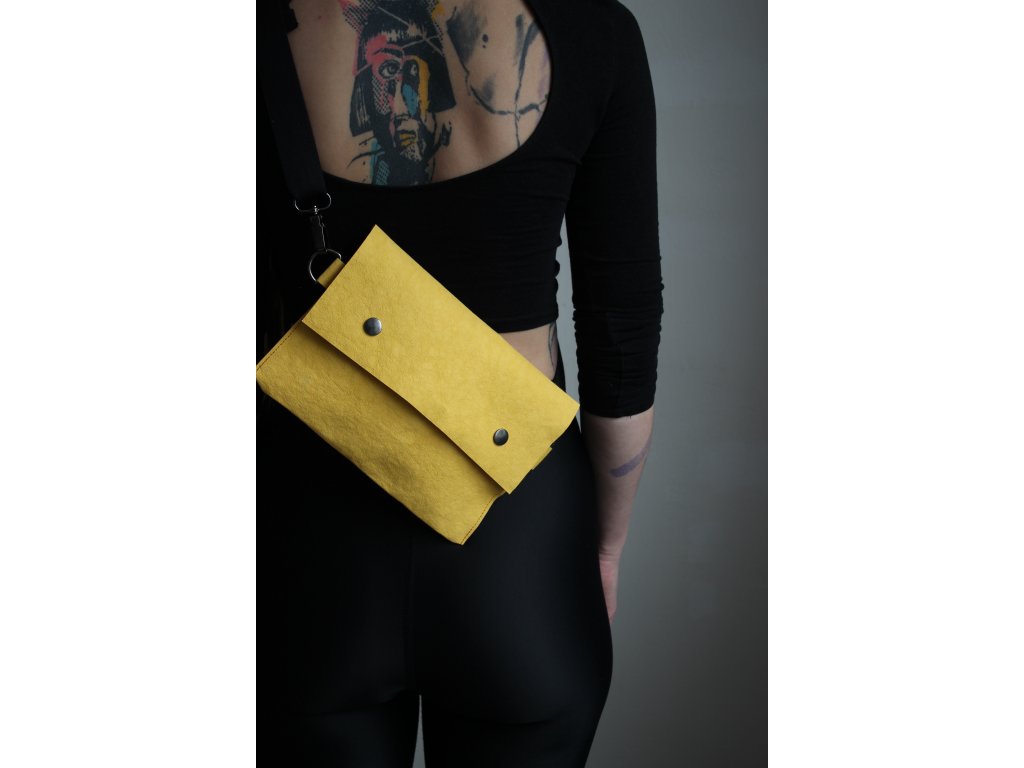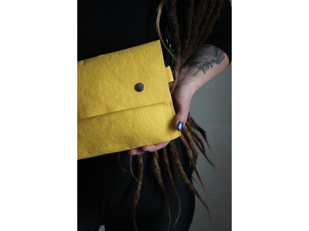 Crossbody kabelka z pratelného papíru . Kabelka má posuvný popruh přes rameno, uvnitř je všitá kapsa a zapínání je na cvoky. Dá se nosit jako crossbody nebo také jako ledvinka kolem pasu. Kabelku lze zhotovit v jiném barevném provedení.