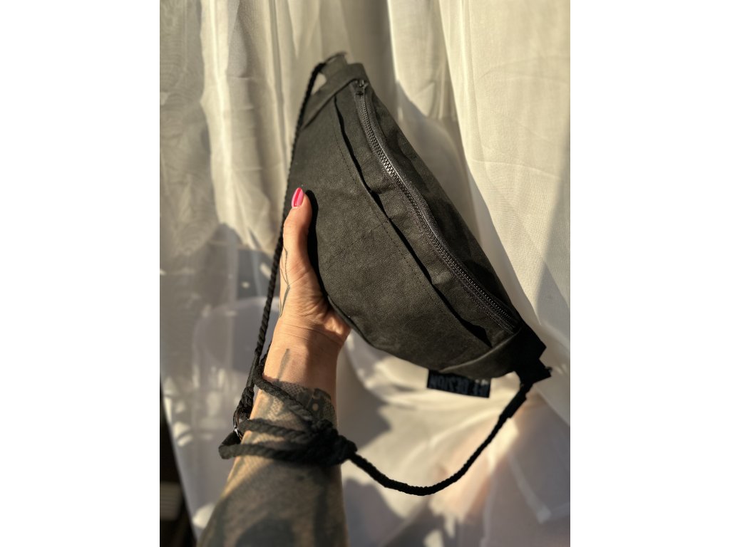 Prostorná ledvinka půlkruhového střihu. Na předním díle se nachází dvě kapsy, zapínání je na zip a popruh z lana lze regulovat dle potřeby. Ledvinka je doplněná o háčkovaný přívěsek, který můžete dát na jiné místo a nebo úplně odepnout.