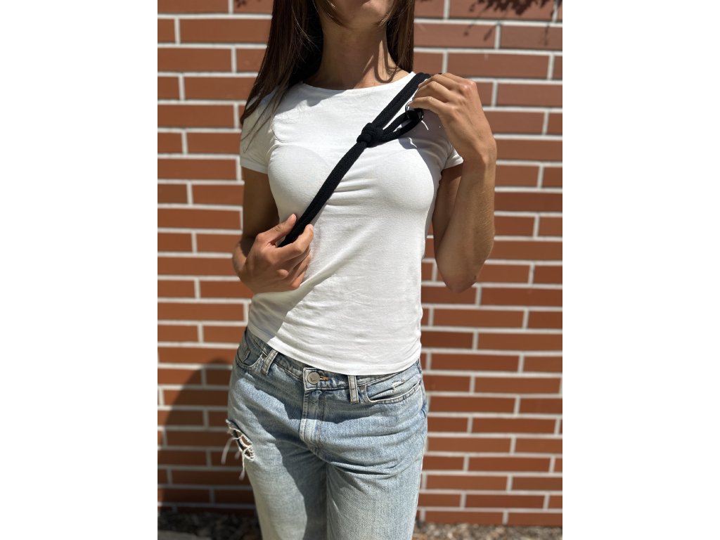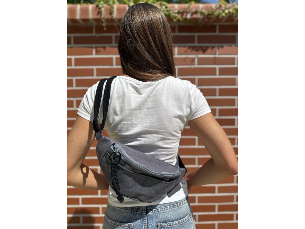 Prostorná ledvinka půlkruhového střihu. Na předním díle se nachází dvě kapsy, zapínání je na zip a popruh z lana lze regulovat dle potřeby. Ledvinka je doplněná o háčkovaný přívěsek, který můžete dát na jiné místo a nebo úplně odepnout.