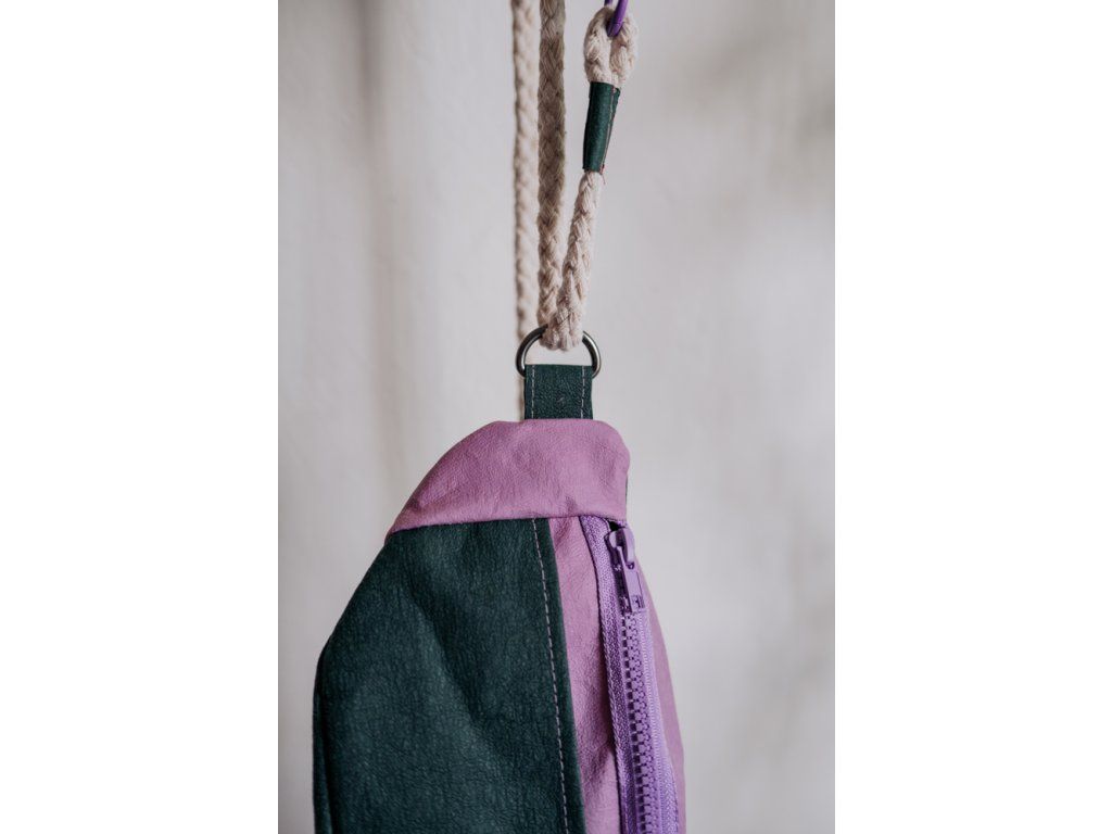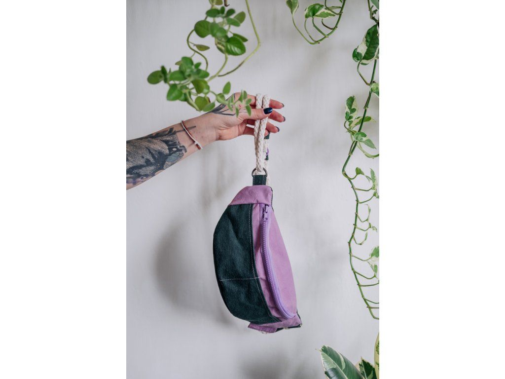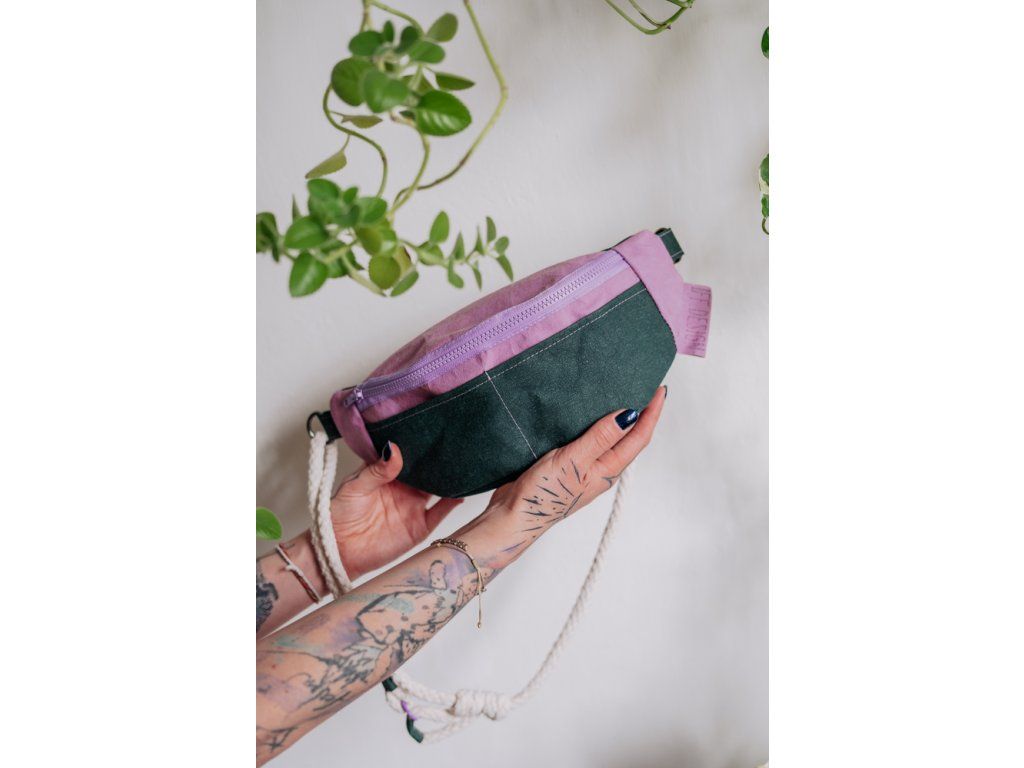 Prostorná ledvinka půlkruhového střihu. Na předním díle se nachází dvě kapsy, zapínání je na zip a popruh z lana lze regulovat dle potřeby.